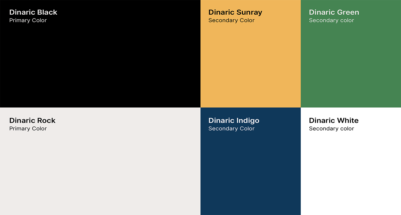 The color system consists of two equally important primary colors (Dinaric Black & Dinaric Rock)and 4 secondary colors (Dinaric Indigo, Green, Sunray and White).