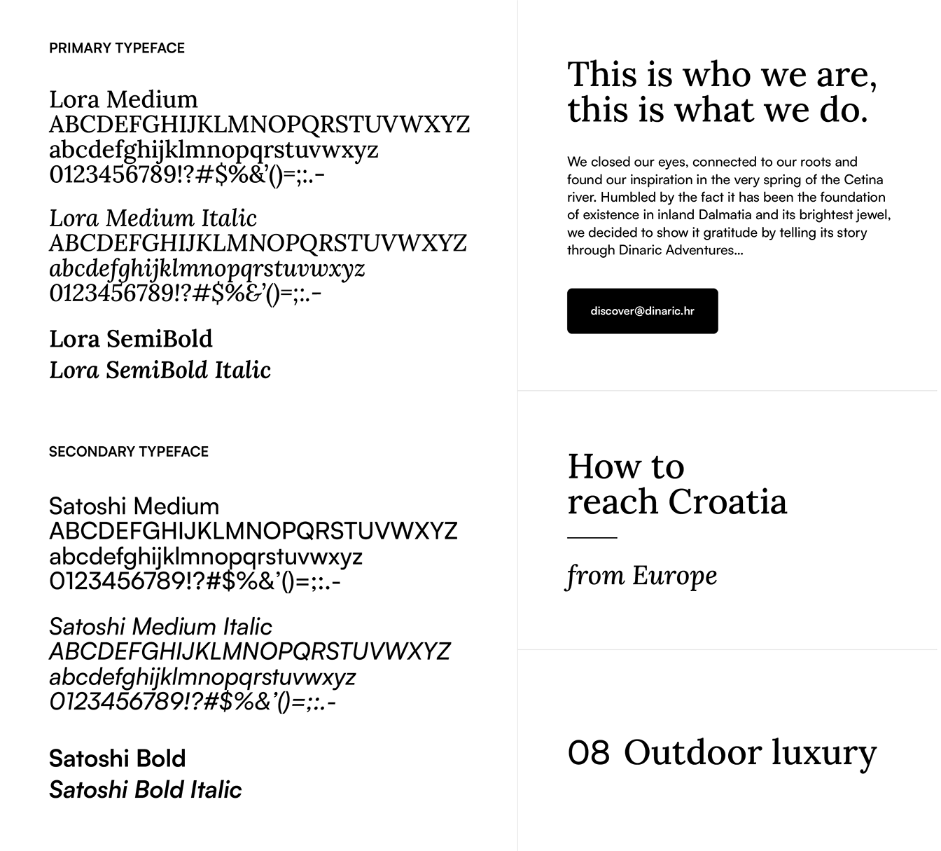 The typography system is based on two typefaces: Lora – in Medium, Semibold weight and Satoshi – in Medium and Bold. The Lora is meant to be used as a title font and Satoshi as a body text font. A clear hierarchy between text elements (size, color and weights) as well as optimum legibility (leading and column width) should always be kept.